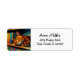 Um gato de desenho animado que dorme numa prateleira de livros retorna etiquetas de endereço.