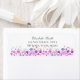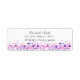 Flores de aquarelas em tons de púrpura, azul e rosa com sotaques de pêssego. Colocado sobre um fundo branco. Flores em tons de roxo, azul e rosa com sotaques de pêssego. Colocado sobre um fundo branco. Personalize com seu nome e endereço em fontes mistas de cinza escura.