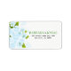 Flores brancas e delicadas, azuis, com folhas sobre fundo branco. Modelo de etiqueta personalizável