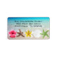 Etiquetas de endereço de devolução personalizadas em um tema tropical de praia. Flores havaianas, estrela-do-mar e uma concha fazem uma borda colorida e marítima sob o texto personalizado. Letras maiúsculas são impressas sobre um fundo de água do oceano turquesa. Use 3 ou 4 linhas para o endereço nesta etiqueta de tamanho médio.