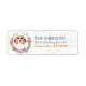 O lado esquerdo destas etiquetas de endereço de retorno apresenta uma imagem de uma coroa de primavera em cores de rosa mole, azul, dourado, verde e creme. No centro está um belo retrato de aquarela de um cachorro Beagle. Pequeno confete de ouro dá um brilho sutil ao fundo. Seu texto personalizado está em ouro azul e marrom à direita.