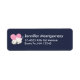 Etiquetas de endereço com uma ilustração gráfica adorável. Uma gatinha branca com uma bela imagem impressa no pelo. Dormindo em paz. Um grande coração rosa atrás dela e algumas estrelas pequenas também. Fundo azul escuro.