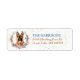 O lado esquerdo destas etiquetas de endereço de retorno apresenta uma imagem de uma coroa de primavera em cores de rosa mole, azul, dourado, verde e creme. No centro está um belo retrato de um Cão German shepherd. Pequeno confete de ouro dá um brilho sutil ao fundo. Seu texto personalizado está em ouro azul e marrom à direita.