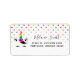 Os Rótulos de Endereçamento Glam Rainbow Unicorn projetados pela Enchantfancy Design Company apresenta o contorno da face de um unicórnio completo com cílios glamourosos, orelhas, um tufo de cabelo e um fabuloso e brilhante chifre unicórnio. Um padrão de estrelas arco-íris sobe o fundo.