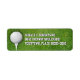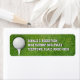 Uma bola de golfe senta-se sobre uma barraca num campo de grama à espera do próximo golfe. Um nome e impressões de endereço de retorno ao lado dele. Perfeito para o entusiasta do golfe, instrutores de golfe, treinadores, equipes, clubes, lojas de esporte ou qualquer retalhista desportivo. Disponível com produtos correspondentes. com