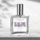 Um rótulo branco para frascos de perfume com a menção "Eau de Parfum" em brilho holográfico e espaço para o nome da sua empresa, o cheiro do produto e o tamanho do produto.