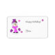 Uma etiqueta de presente de excelente com um bonitinho bonitinho bonitinho de neve de chapéu roxo, mitenes e cachecol. Rosie bochecha e nariz de cenoura laranja.