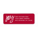 As etiquetas de endereço de feriado contêm a palavra "alegria" em um script branco moderno em um fundo vermelho.