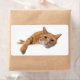 Retrato de uma taça laranja de taça doméstica de gato deitado sobre um fundo branco com pata cortada sobre uma mesa
