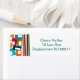 Essas etiquetas de endereço de retorno têm uma design de linhas e retângulos modernos do século médio em tons retrorados de laranja, ouro, morango, verde, azul, turquesa e verde.
