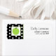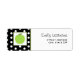 Etiquetas de endereço com uma ilustração de uma moldura dentro de maçã verde com guarnição verde à esquerda. Fundo preto com bolinhas brancas e jato verde. Personalize o lado direito com seu nome e endereço. Procure por papelaria, cartas e mais na Paperie de Jill.