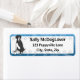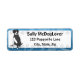 As etiquetas de endereço do Morto Mantle Great Dane têm um desenho da raça gigante de cães sentada à esquerda. O fundo tem pegadas, e a borda é azul.