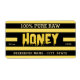 Rótulos de mel listrado preto e dourado com tipografia de mel pingando dourado e texto personalizado para nome da empresa de apicultura, informações de contato e peso líquido do produto.