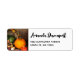 Devolver etiquetas de endereço com uma fotografia de uma colheita de ação de graças, colocada numa mesa de madeira rústica. Abóbora, batatas, abóbora, etc... constituem esta bela coleção de comidas. Folhas coloridas do outono rodeiam a cesta da cornucopia.