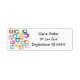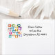 Essas etiquetas de endereço de retorno têm um design de retângulos que são esticados em uma extremidade em tons ranhosos de laranja, verde, lacre, roxo, azul, rosa e amarelo com linhas atômicas que os atravessam.