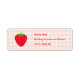 Belo design de morango vermelho brilhante, com um topo verde e um fundo de verificação de gingham de rosa claro.