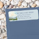 Etiquetas de endereço de volta para o seu convite de casamento ou envelopes rsvp, com design cênico de cor d'água em tons de azul empoeirado e verde. A cena do lago apresenta montanhas, verde e pinheiros, o lago e um céu leve. Todo o texto do nome e endereço é editável e se você quiser produtos correspondentes, navegue na minha coleção Mountain Lake.