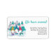 Rótulos de Novos Endereços Festivos com gnomos de tendências e floresta de árvores de natal decoradas. O texto "nós movemos" é escrito em tipografia de script legal ou você pode editá-lo para "Eu movi" ou "Meu Novo Endereço", por exemplo. O modelo também está pronto para você adicionar seu nome e endereço na tipografia moderna das cinzas escuras.