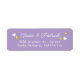 O seu endereço residencial personalizado de forma fácil... etiqueta de cor púrpura pálida com duas linhas de texto alinhadas pelo centro, e nomes de noiva e noiva escritos num estilo de letra com na moda com a imagem de pequenos corações de amor, brancos e dourados.