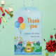 Gift tag para o aniversário de crianças é um hipopótamo que celebra o aniversário no rio trazendo balões, bolo de aniversário e tocando música. Todo texto pode ser personalizado. #hippo #aniversário #anidaygifttag #balões #bolo de aniversário #hippopotamus #rio #grama #zazzlemade #thankyou #gifttag