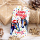 Boas festas de Natal etiquetas de presentes, aquarela dois belos cavalos vestindo chapéus de Papai Noel vermelhos com confete caindo