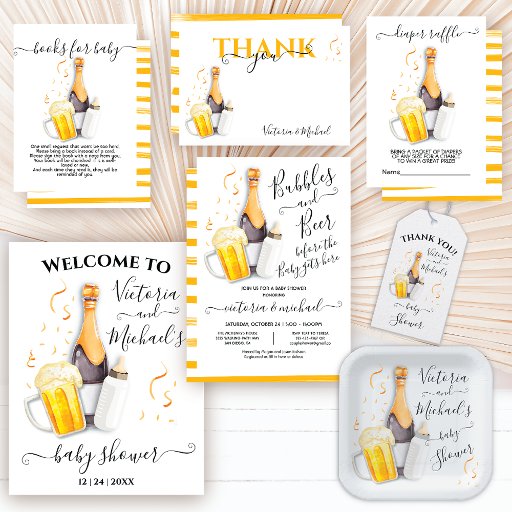 Celebre os novos pais a estarem com este simples e moderno chá de fraldas "Bolhas e Cerveja". Possui uma garrafa de bebê, Champagne e um copo de cerveja. Todos os textos podem ser alterados.