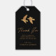 Estas lindas etiquetas de favor de casamento mostram dois pássaros voando juntos em folha de ouro falso sobre um fundo preto puro. Folha de ouro falsa lê, "Obrigado" na tipografia da na moda. Elegante, elegante, moderno e único - perfeito para os hóspedes no seu dia especial!
