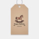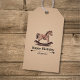 Uma etiqueta para presente com um gradiente e fundo bege texturizado e uma ilustração de um cavalo de balanço feito à mão em tons marrons. Perfeito para os seus presentes para uma criança.