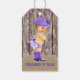 Etiquetas de presente para chá de bebê cowgirl roxa com adorável vaqueira usando calças roxas com babados, botas de cowboy e chapéu em um fundo rústico de madeira e aniagem. Você pode personalizar com seu texto. Este é um design impresso sem aniagem, madeira, etc. reais.