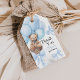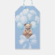 Etiquetas de presente de Chá de fraldas azul com um urso bebê fofo. Podemos Esperar pelo tema do chá de fraldas do urso.