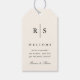 Elegante design de monograma de casamento mostra suas iniciais em serif preto clássico com letras bissecadas por uma fina linha vertical em um fundo de sono quente. Personalize com três campos de texto editáveis; mostrados com uma mensagem de boas-vindas, fazer que esses marcadores sigam o toque perfeito para as bolsas de boas-vindas do casamento de destino.