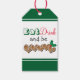 Slogan "Coma, Beba e seja feliz" com biscoitos em forma de coração de pão de gengibre e decoração oca em etiquetas de presentes de Natal.