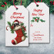 Na frente desta etiqueta de presentes de Férias está uma imagem de um adorável filhote Chihuahua espreitando de uma estocagem vermelha ornamentado. A imagem é cercada por groselhas ocas, vermelhas e poinsettia floresce. O texto no topo diz "Feliz Natal". A parte de trás da etiqueta tem outra imagem de uma imagem de preto-e-branco, com campos de texto em vermelho para que você personalize.