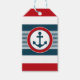 Design náutico com decoração em forma redonda com âncora sobre fundo listrado a azul, vermelho e branco