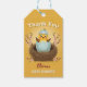 Adoráveis etiquetas de agradecimento para chá de bebê com um lindo pintinho amarelo eclodindo de uma casca de ovo azul em um ninho aconchegante, cercado por delicadas flores de primavera cor-de-rosa.
