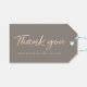 Esta etiqueta de presente de obrigado pode ser personalizada com seus nomes e data de casamento e apresenta uma letra falsa de script de pincel de folha de rosa em um fundo de cinza.