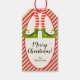 Pernas de elfo divertidas vestindo meias riscadas vermelhas e marfim e botas verdes com sinos de jingle e detalhes de sua festa natalícia em letras quentes, essas etiquetas de presentes são perfeitas para sua festa de feriado no escritório, amigos e presentes de Natal em família e muito mais. CORRESPONDENDO a itens na nossa loja.