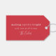 Uma etiqueta de presente de feriado moderna na moda com uma tipografia clássica, que cita "Espíritos do fazer brilhantes - com amor no natal", combinada com uma letra manuscrita para o nome da sua família em branco com uma cor vermelha brilhante no estilo de design escandinavo "scandi". A saudação e o nome podem ser facilmente personalizados para um toque pessoal.
