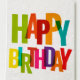Uma etiqueta de aniversário vibrante com as palavras "Feliz Aniversário" em letras corajosas e coloridas. Cada letra mostra uma tonalidade brilhante diferente, criando uma atmosfera festiva e alegre. A etiqueta foi projetada com um fundo branco limpo.