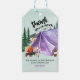Acampando o obrigado que você tem etiquetas de presentes - perfeito para churrasco de quintal, piquenique ou festas de aniversário ao ar livre. Esta horta e design de aquarela lilática tem uma montanha e uma paisagem florestal com tenda, fogueira e fungos. O título diz "obrigado tanto" e o obrigado restante que a mensagem é totalmente editável.
