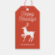 Essas etiquetas de presente de na moda têm impressão colorida de cheio em ambos os lados e apresentam uma ilustração de um veado e as palavras Feriados Felizes. Paleta de cores vermelha e branca. Personalize com seu nome. Escolha a sua cor de fio.