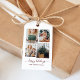Estas simples, mas ultra modernas etiquetas de presentes de Natal apresentam quatro das suas fotografias pessoais favoritas numa grelha de fotografias de aparência única e em camadas. O design preto, vermelho-tijolo e branco diz "feriados felizes" em tipografia elegante, manuscrita de tendências, e tem um lugar para o seu nome em uma fonte coordenadora sans serif.