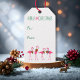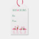 As etiquetas de presentes de Natal Flamingo com socos furtivos para amarrar a presentes. Rosa e verde em marcas brancas com "para" e "de" e "de" e "feliz natal" no topo. Quatro aves festivas vestem mortes tropicais no fundo, com um grande flamingo no fundo.