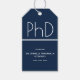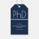Etiquetas de presentes para uma festa de formatura de doutorado com um design azul e branco. Este item faz parte de uma coleção de festas de formatura que inclui um convite, anúncio de fotos, guardanapos de papel, cartões de lugar e muito mais. Personalize esses itens, adicione-os ao seu carrinho e celebre essa grande conquista.