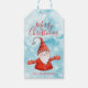 Crio na moda personalizado etiquetas de presentes de Natal com um design bonito que apresenta um ditado Feliz de Natal e um gnomo alegre em roupa vermelho sobre um fundo azul de neve. É fácil adicionar seu nome de família usando texto de modelo.