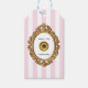 Esta etiqueta de presente adorável é perfeita para o próximo brunch, festa de aniversário ou festa de solteira. O design apresenta um fundo listrado cor-de-rosa e branco com um quadro de ornamentado ao redor de uma campainha com texto que diz "pressione para champanhe". Você pode mudar a palavra champanhe para qualquer coisa que seu coração desejar clicando em "personalizar".