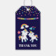 Etiqueta de presente de agradecimento com 2 lindos unicórnios dançantes com caudas e crinas brilhantes e coloridas. Um arco-íris colorido com nuvens de cada lado acima de suas cabeças. Outros elementos incluem uma pequena flor, um coração e algumas estrelas. Fundo roxo escuro. Pontos de confete coloridos e uma imagem de uma bandeira de festa ao longo da parte superior.