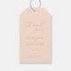 This elegant wedding favor tag features a soft, blush pink background with delicate gold typography that exudes sophistication and warmth. The design is minimalist yet charming, perfect for expressing gratitude to guests on your special day. With its simple layout and graceful script, it captures the timeless elegance of a romantic celebration. Ideal for adding a touch of class to your wedding favors, this tag complements any classic or modern wedding theme.
