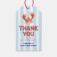 Kids birthday thank you gift tags featuring an enchanting lobster and a chic striped blue and white background provide a stylish way to express your gratitude. The customizable text template allows for a quick and easy personal touch for each guest. These tags are ideal for any ocean-themed or beach party. Try these unique tags for your child's next birthday.