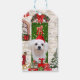O Natal do Cão Maltês sentado do lado de fora da casa decorada com coroa de Natal, a árvore de Natal é uma ideia perfeita de presente de Natal para amantes de cães.